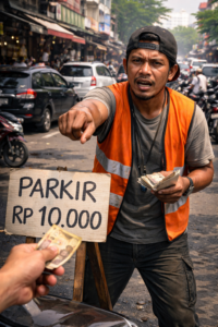 Dalam konteks hukum, praktik parkir liar yang dilakukan dengan cara memaksa pengguna jalan untuk membayar sejumlah uang dapat dikualifikasikan sebagai tindak pidana pemerasan. Perbuatan tersebut dapat dijerat Pasal 368 Kitab Undang-Undang Hukum Pidana (KUHP), dengan ancaman hukuman penjara paling lama sembilan tahun.
